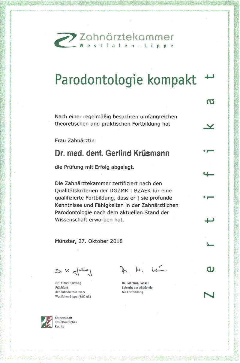 dungen des Zahnfleisches (Gingivitis) und des Zahnbettes (Parodontitis) gehören zu den häufigsten Krankheiten: 30 bis 50% der Erwachsenen sind davon betroffen. Dr. Krüsmann ist Expertin für Zahnfleischerkrankungen. In einem zwölfmonatigen Curriculum an der Fortbildungsakademie der Münsteraner Zahnärztekammer hat sie das Zertifikat „Parodontologie kompakt“ erworben.